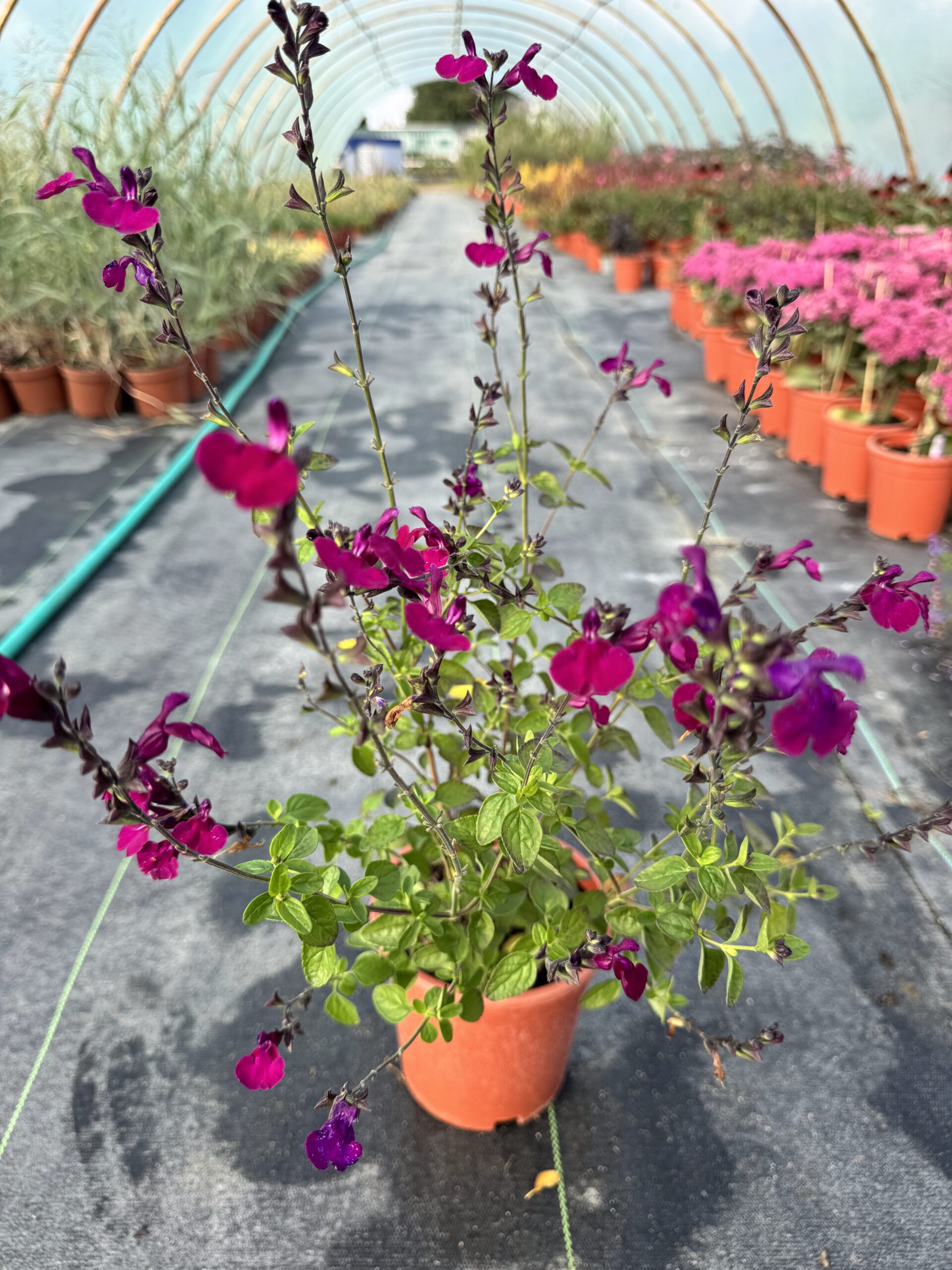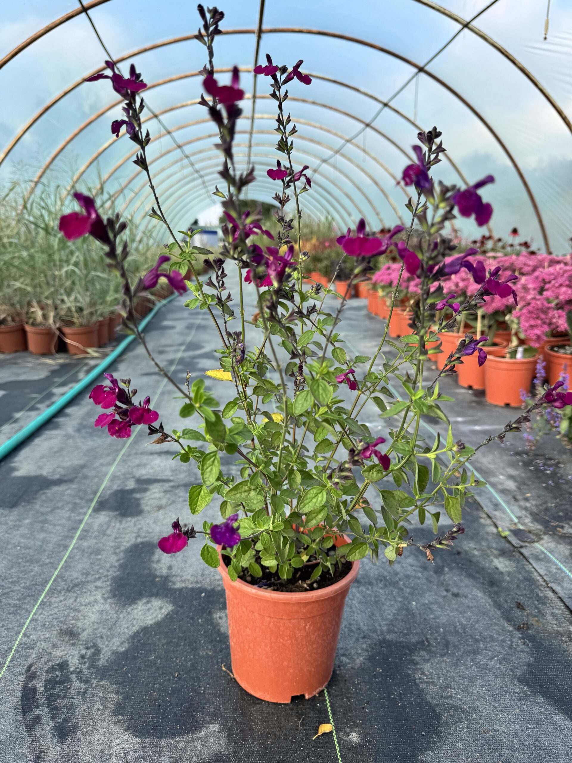 To nowoczesna, kompaktowa odmiana szałwii omszonej, ceniona za długie kwitnienie, mocny kolor i niewielkie rozmiary. Tworzy gęste, zwarte kępy. Pokrój jest kulisty, dobrze utrzymany, dzięki czemu roślina wygląda schludnie i elegancko przez cały sezon. Kwitnie od czerwca do sierpnia, a przy odpowiednim przycięciu po pierwszym kwitnieniu – często powtarza kwitnienie pod koniec lata. Kwiaty są zebrane w wyprostowane, fioletowo-purpurowe kłosy, bardzo liczne i dekoracyjne. Liście są zielone, lekko karbowane i aromatyczne – po roztarciu wydzielają typowy, ziołowy zapach.