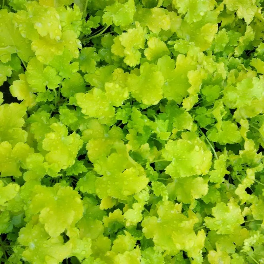 To bardzo efektowna, energetyczna odmiana żurawki, znana ze swoich intensywnie limonkowych liści, które natychmiast przyciągają uwagę w każdej kompozycji ogrodowej. Liście są zaokrąglone, lekko karbowane, tworzą zwarte, gęste kępy. Ich jasna, niemal neonowa zieleń doskonale kontrastuje z ciemniejszym tłem innych roślin i świetnie rozjaśnia cieniste części ogrodu.