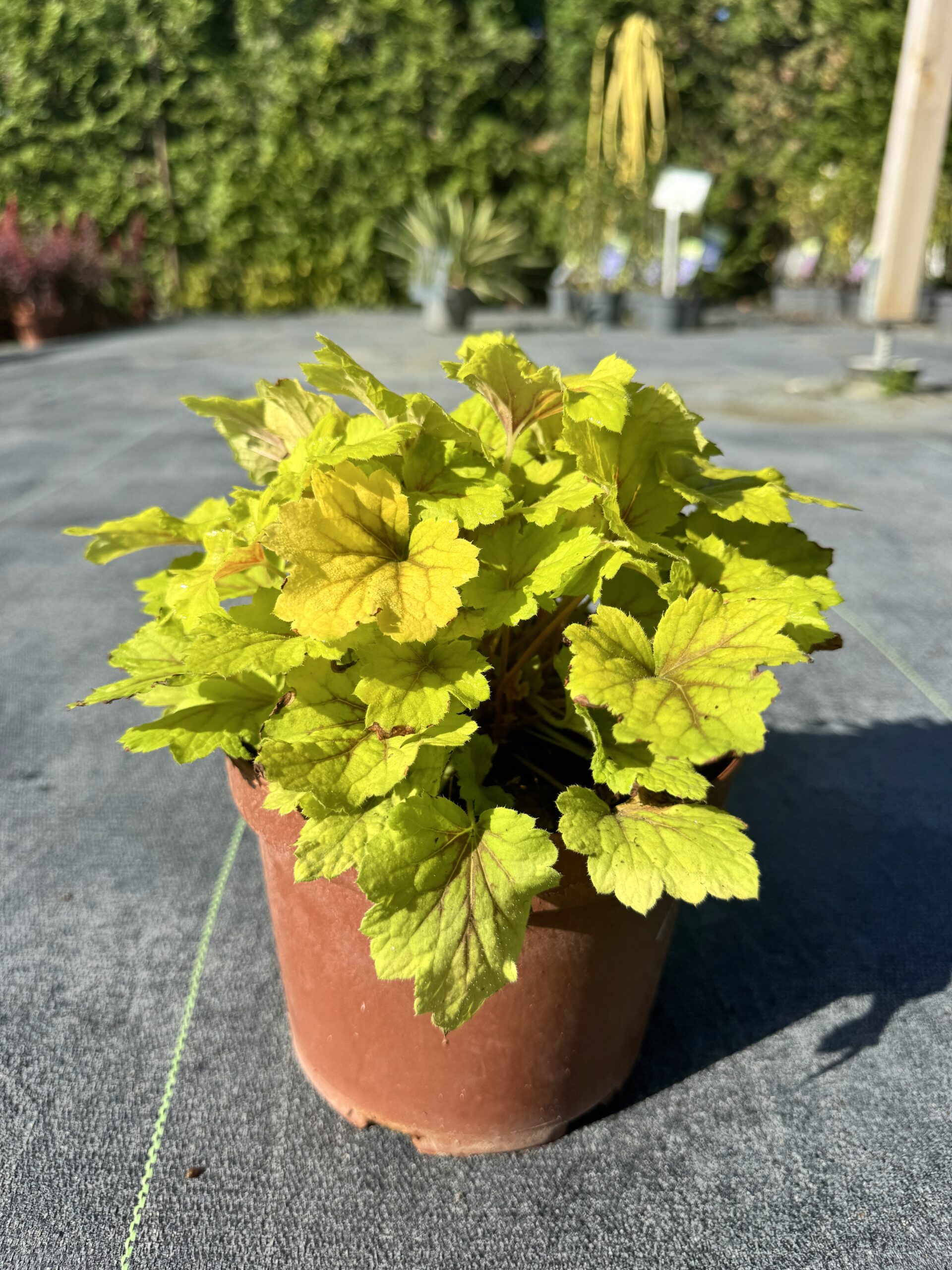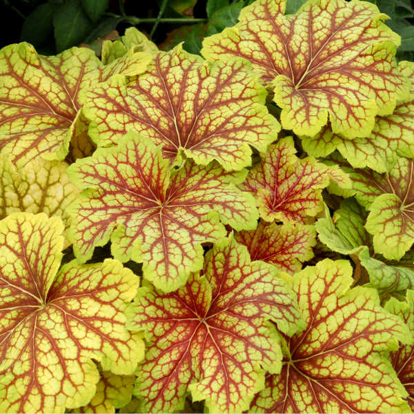 o wyjątkowo dekoracyjna odmiana żurawki, która zachwyca wyrazistym kontrastem kolorystycznym liści. Blaszki liściowe mają jasnożółtą, niemal limonkową barwę, a ich powierzchnię przecinają intensywne, czerwone nerwy, tworząc efekt błyskawicy – stąd nazwa 'Red Lightning’. Ulistnienie jest lekko powcinane, z falowanymi brzegami, osadzone w gęstych, niskich kępach, które zachowują zwarty pokrój przez cały sezon.