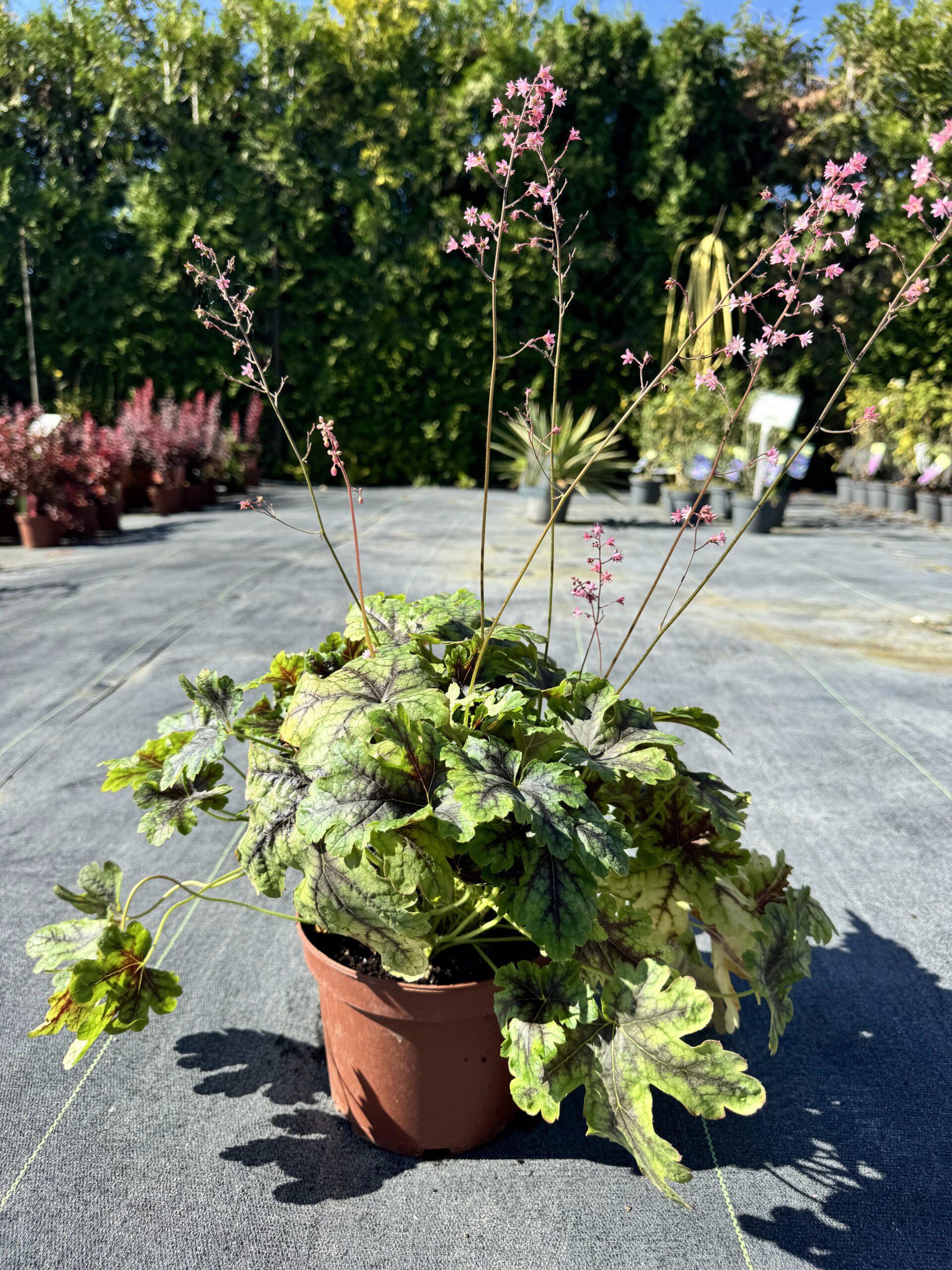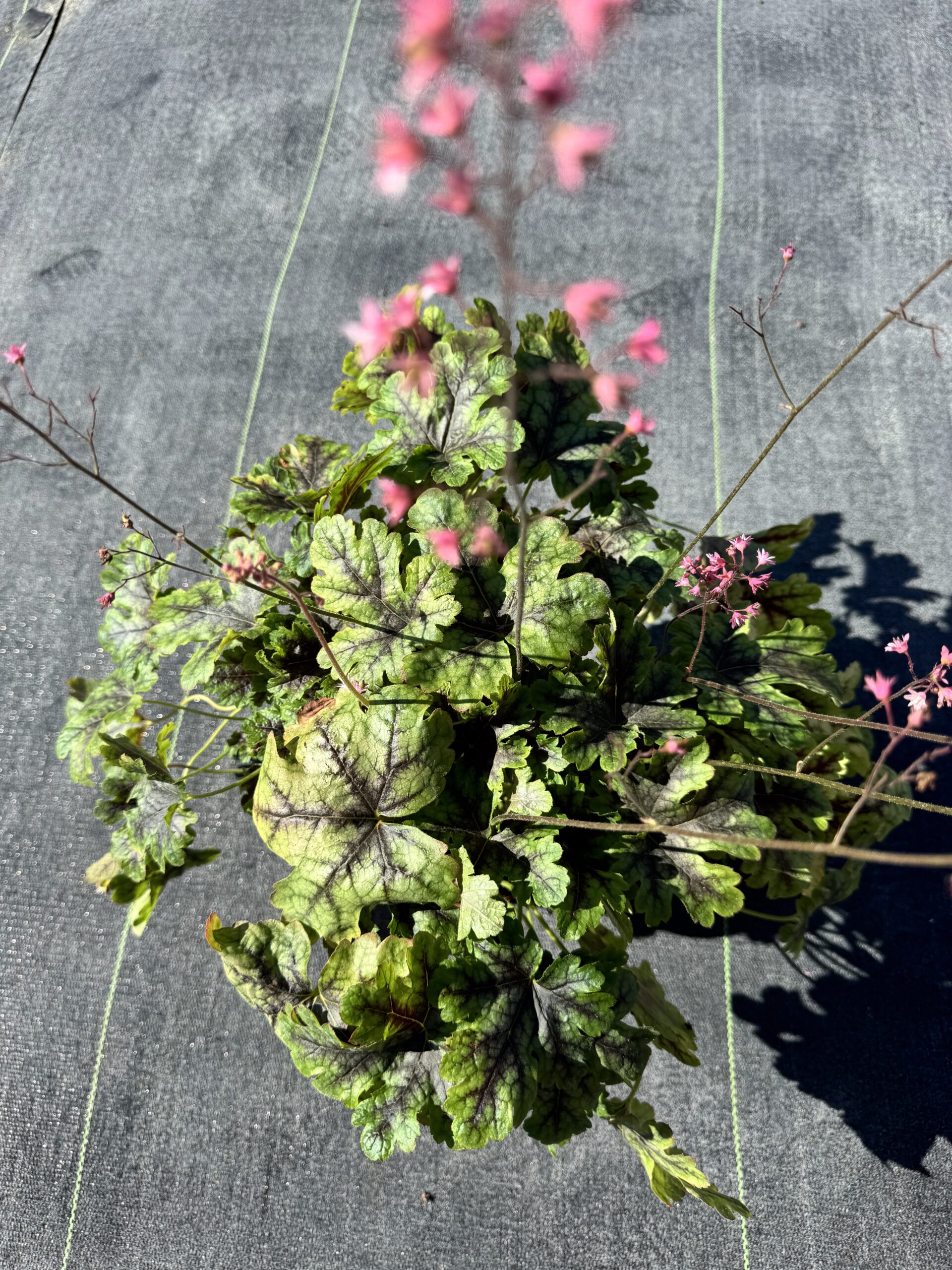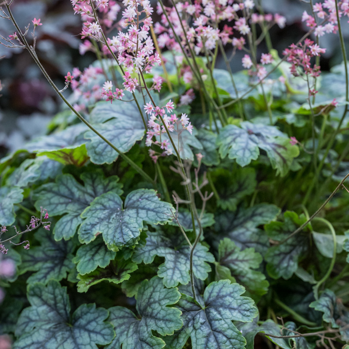 To niezwykle dekoracyjna i oryginalna odmiana żurawki, ceniona za wyjątkowe, wielobarwne liście o ciekawym, marmurkowym wzorze. Blaszki liściowe mają kolor niebieskozielony lub stalowozielony, ozdobione są wyraźnymi, ciemnymi (granatowymi do purpurowych) nerwami, a od spodu przybierają intensywnie bordowy odcień. Taki kontrast sprawia, że roślina wygląda bardzo efektownie przez cały sezon. Kształt liści jest lekko powcinany, co dodaje kępie lekkości i strukturalnej elegancji.