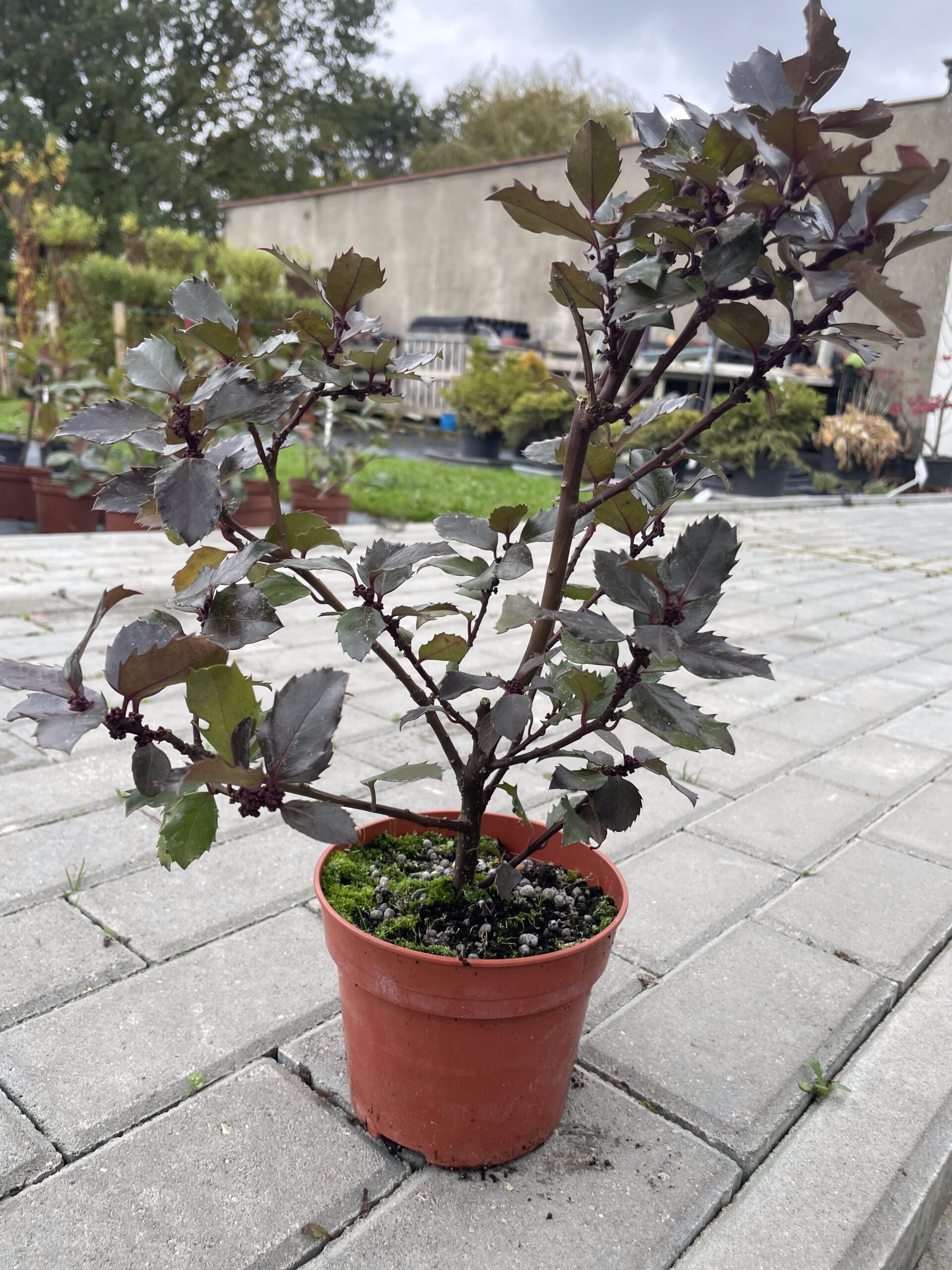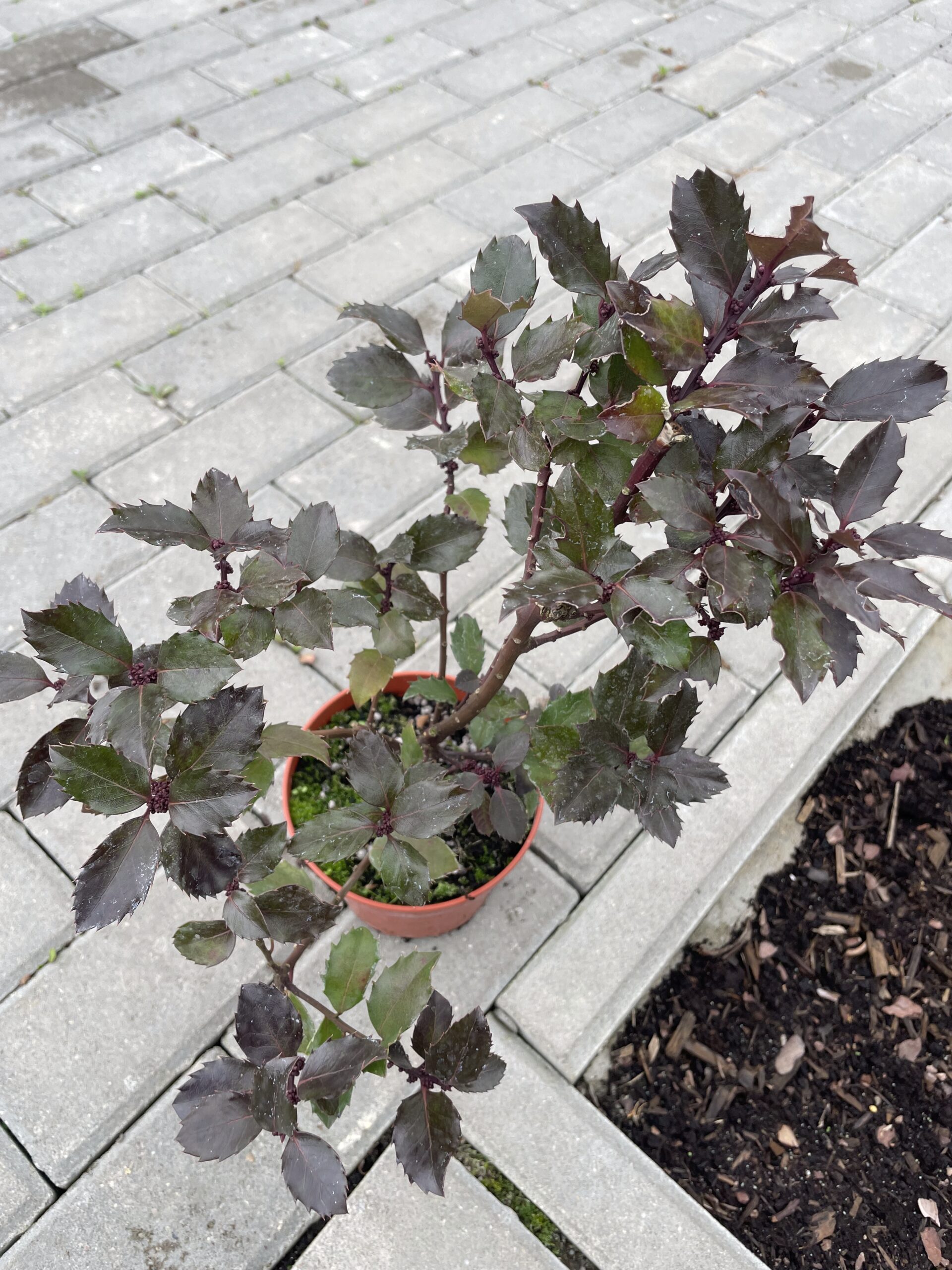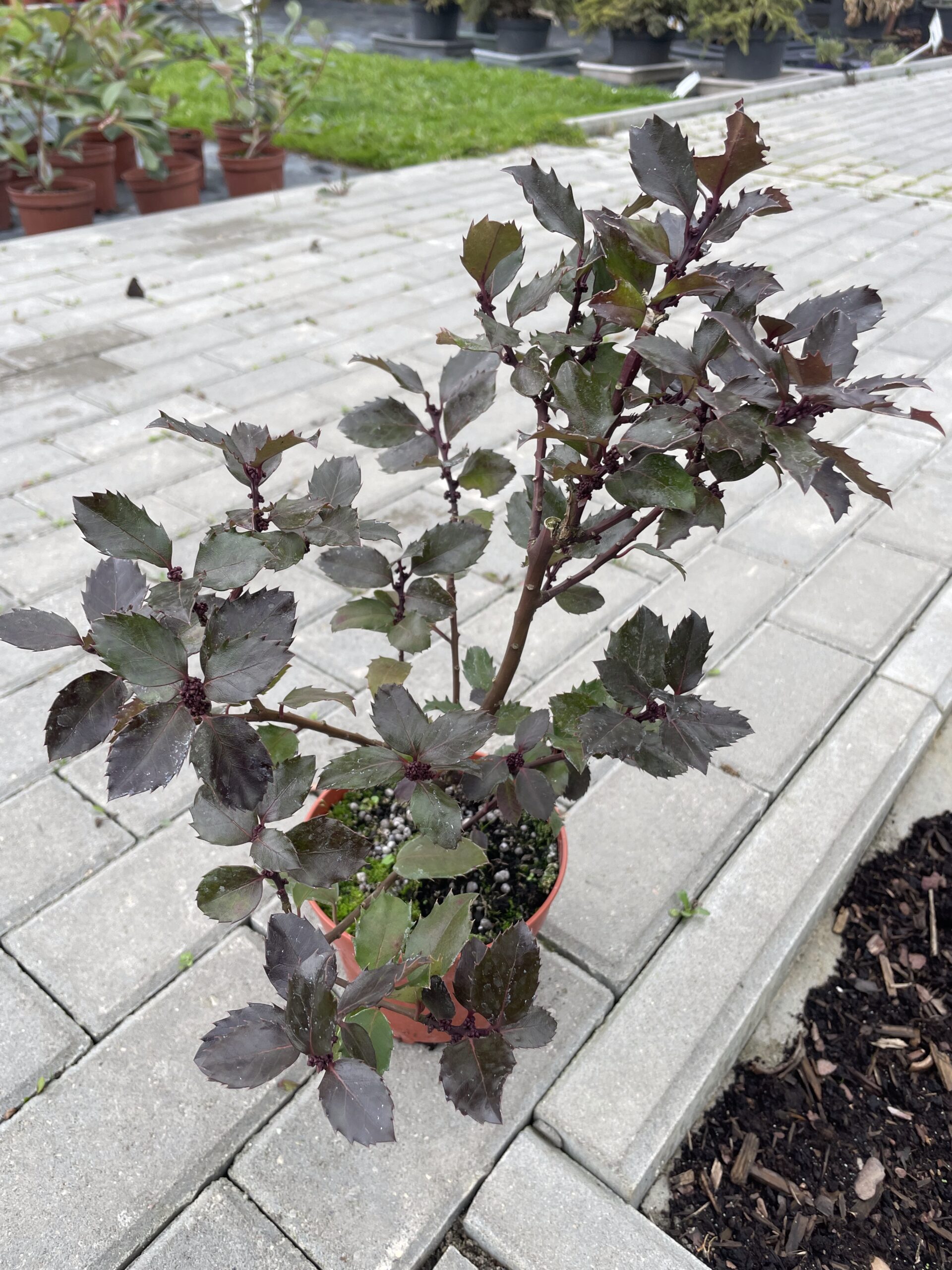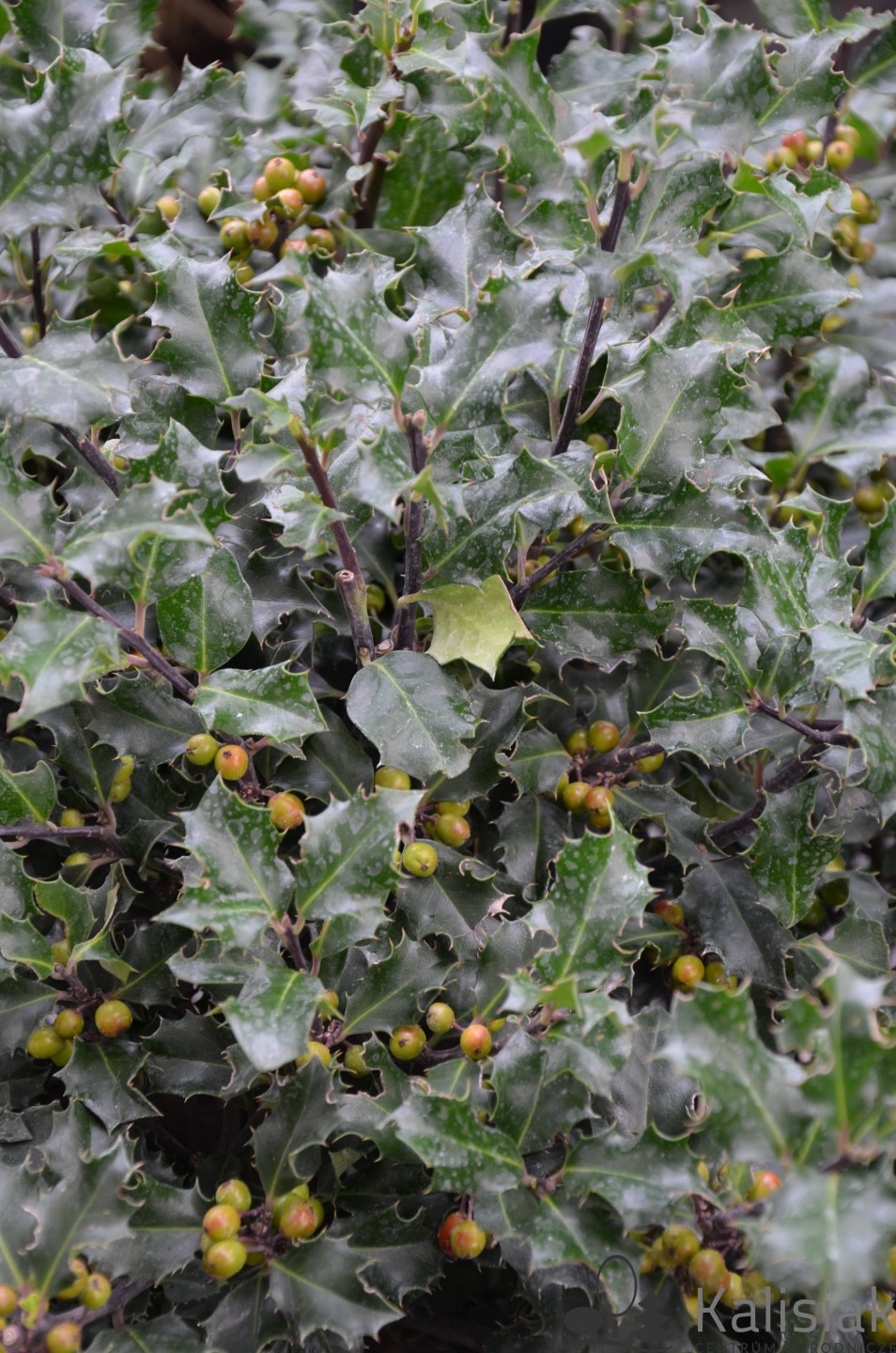 to zimozielony krzew ozdobny o zwartym, stożkowym pokroju i wyjątkowo dekoracyjnym ulistnieniu. Liście są skórzaste, błyszczące, ciemnozielone z niebieskawym odcieniem — stąd nazwa odmiany. Brzegi liści są lekko kolczaste, co dodaje roślinie strukturalnego charakteru, a zarazem odstrasza zwierzęta. Nadaje się na żywopłot.