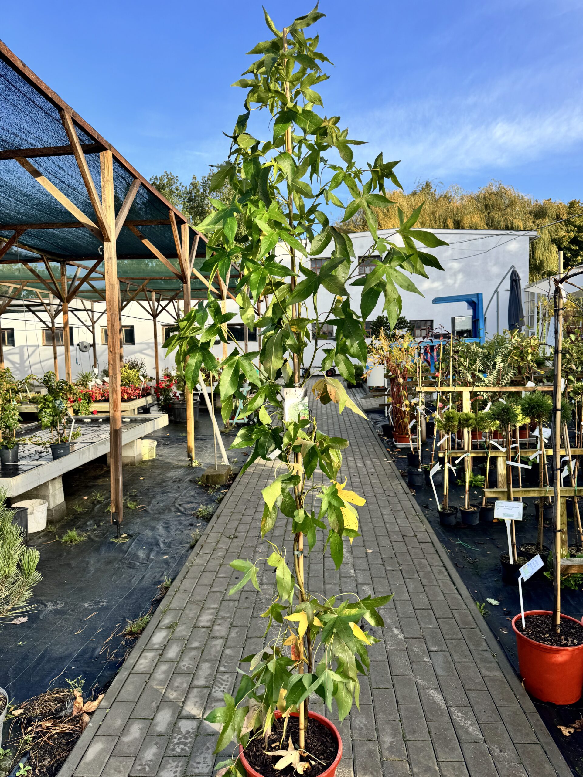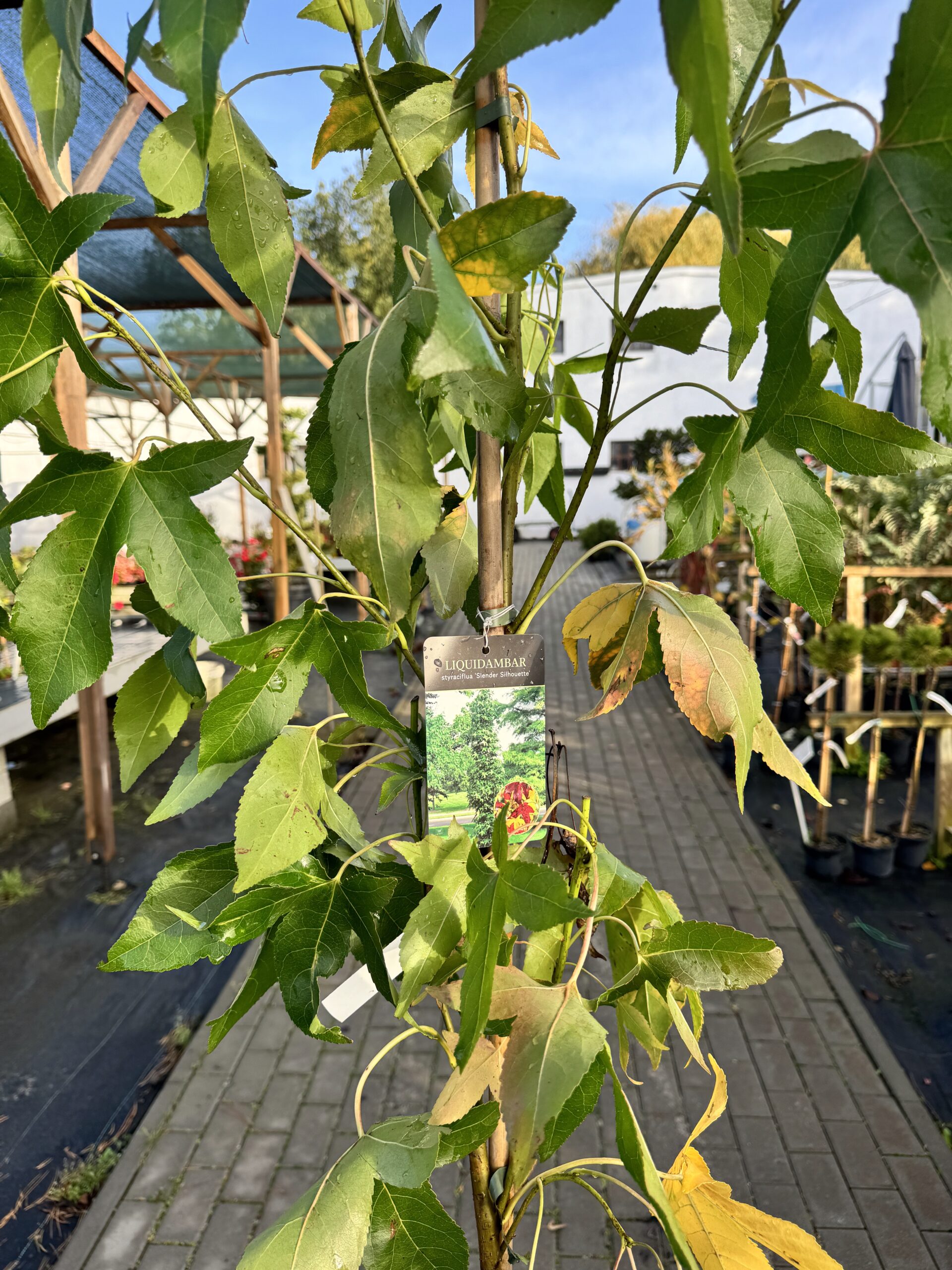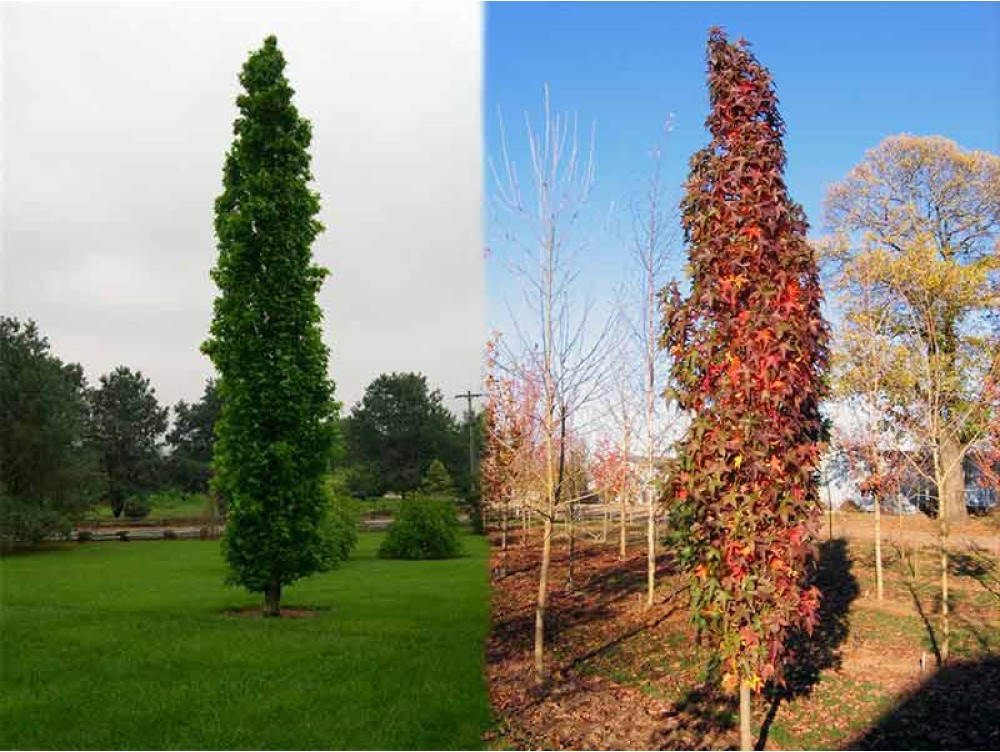 to wyjątkowa, kolumnowa odmiana ambrowca o bardzo wąskim, pionowym pokroju, osiągająca nawet do 10–15 metrów wysokości przy zaledwie 1–2 metrach szerokości. Idealna do nasadzeń wąskich pasów, alei, nowoczesnych ogrodów oraz tam, gdzie ograniczona jest przestrzeń pozioma.