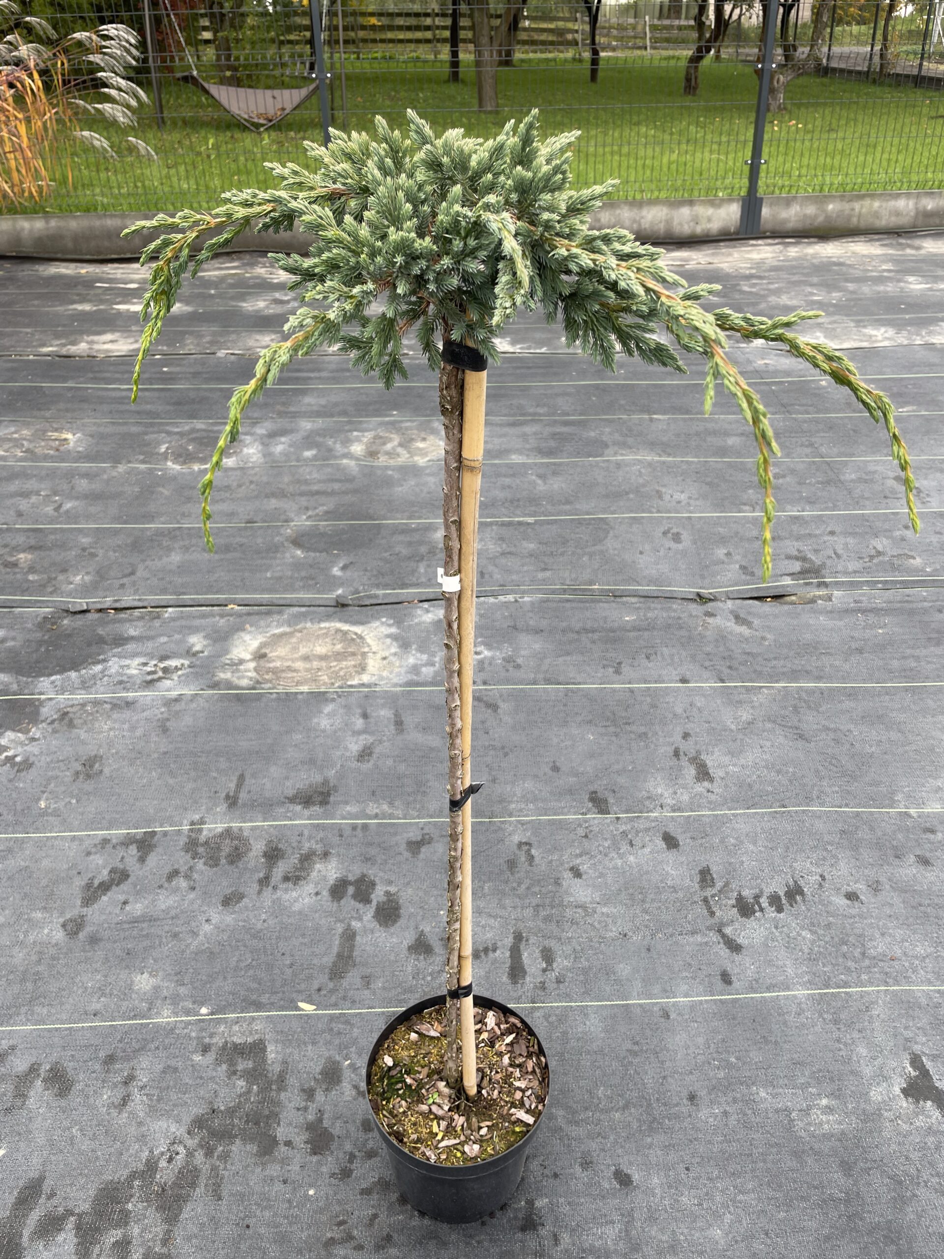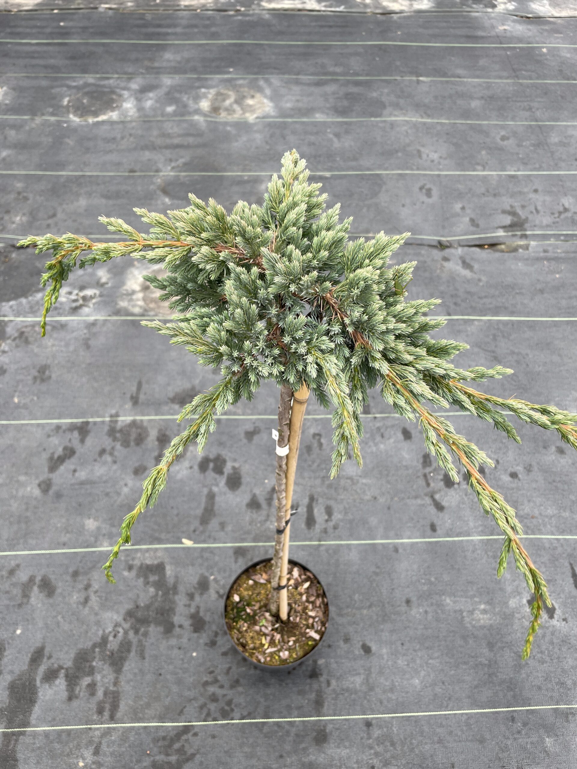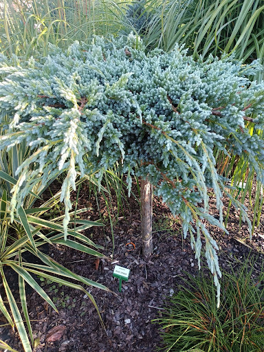 to oryginalna, karłowa odmiana jałowca łuskowatego o płożącym pokroju i efektownym, pajęczynowym układzie pędów. Jej charakterystyczną cechą są lekko powyginane, nieregularne pędy pokryte intensywnie srebrzystoniebieskimi igłami, które nadają roślinie unikalny wygląd przez cały rok.