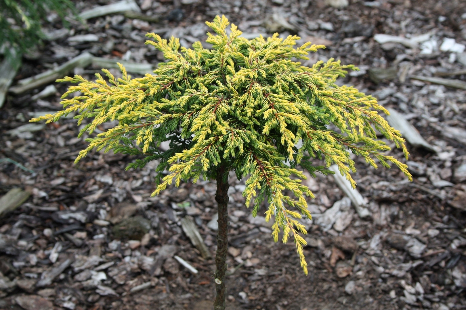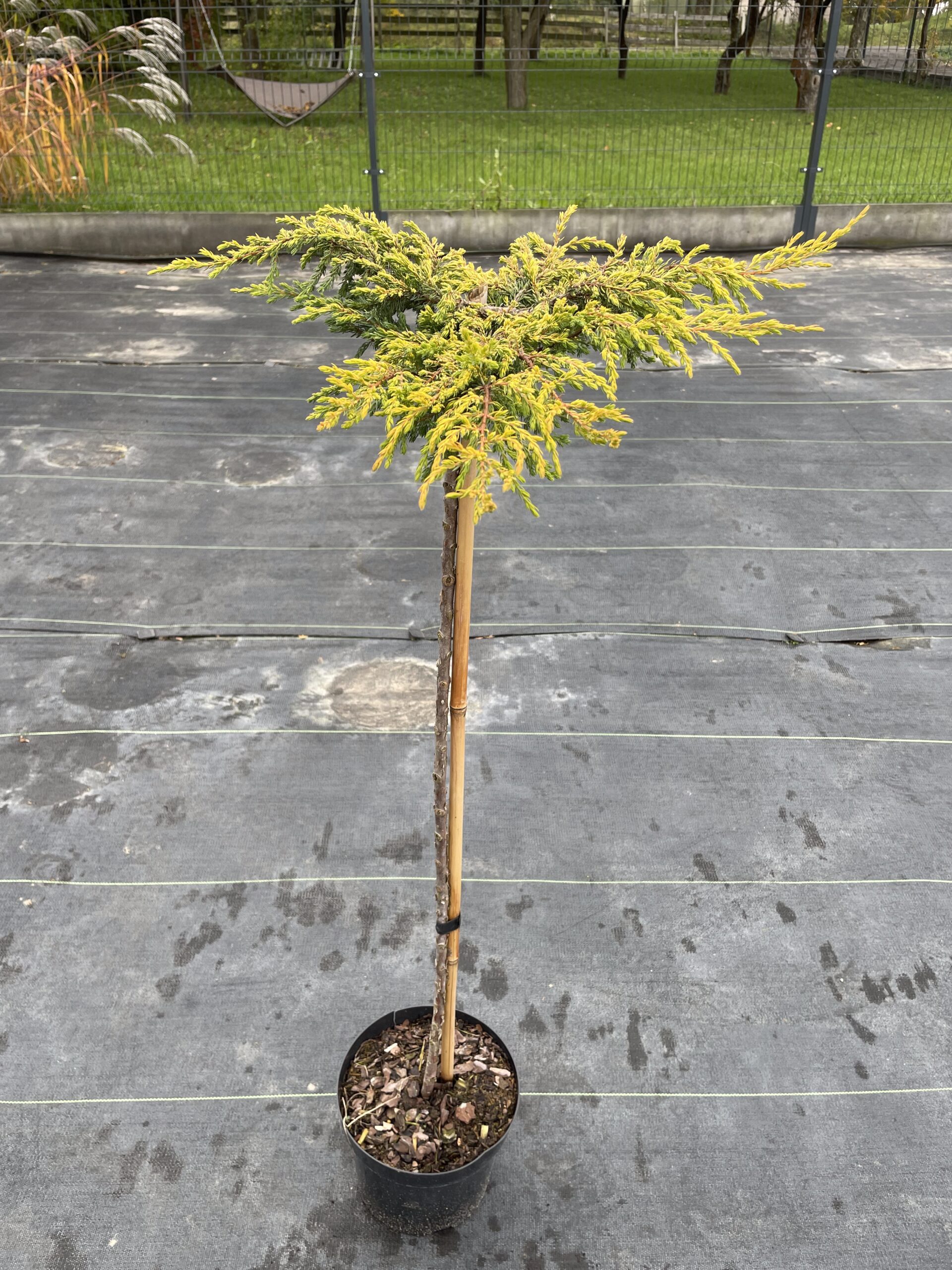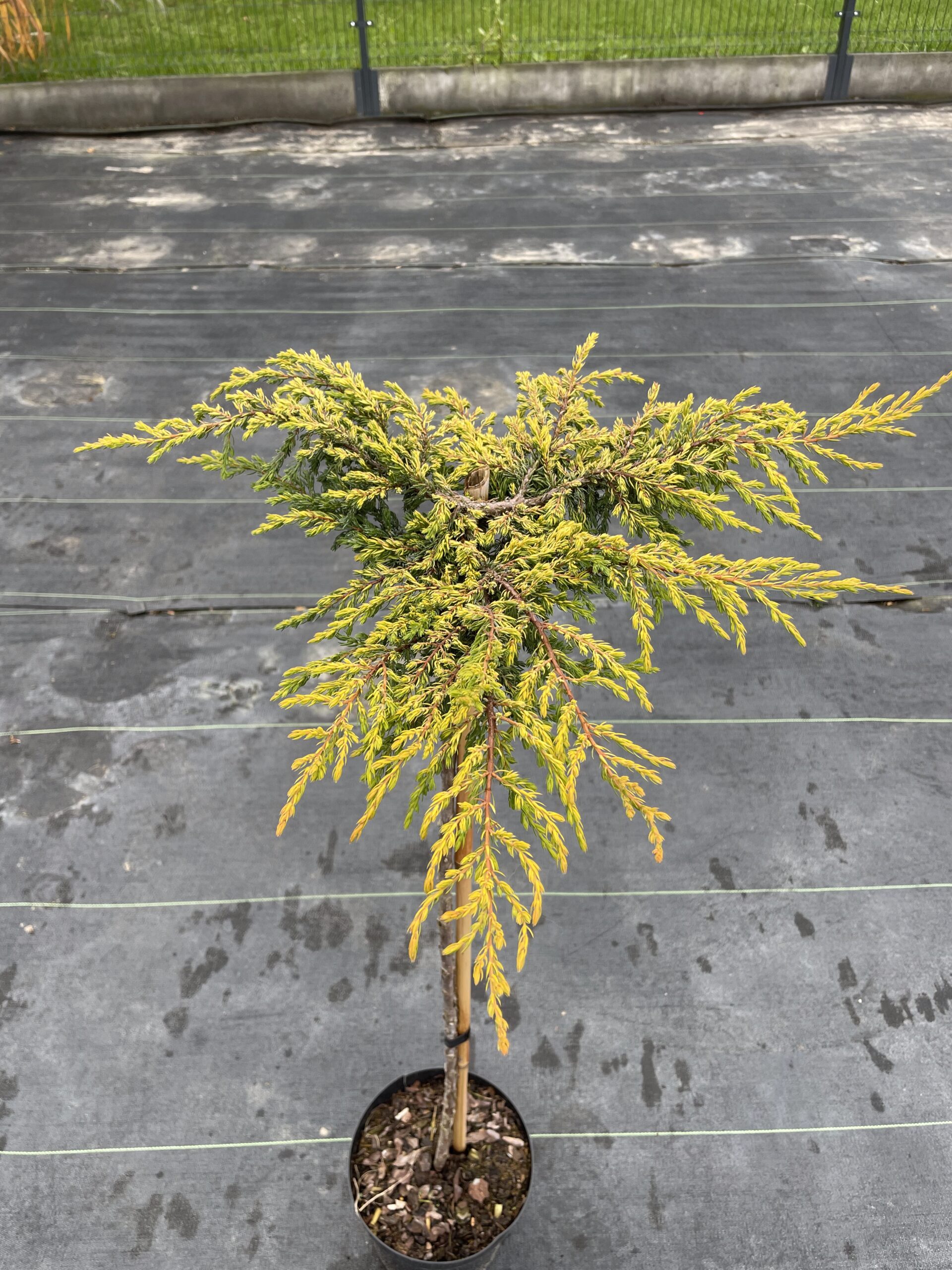 szczepiony na pniu to efektowna forma dekoracyjna o przewieszającym się pokroju i intensywnie złocistym ubarwieniu igieł. Odmiana ta wyróżnia się niskim, płożącym wzrostem, ale w wersji szczepionej tworzy „fontannę” z opadających, żółto-złotych pędów.