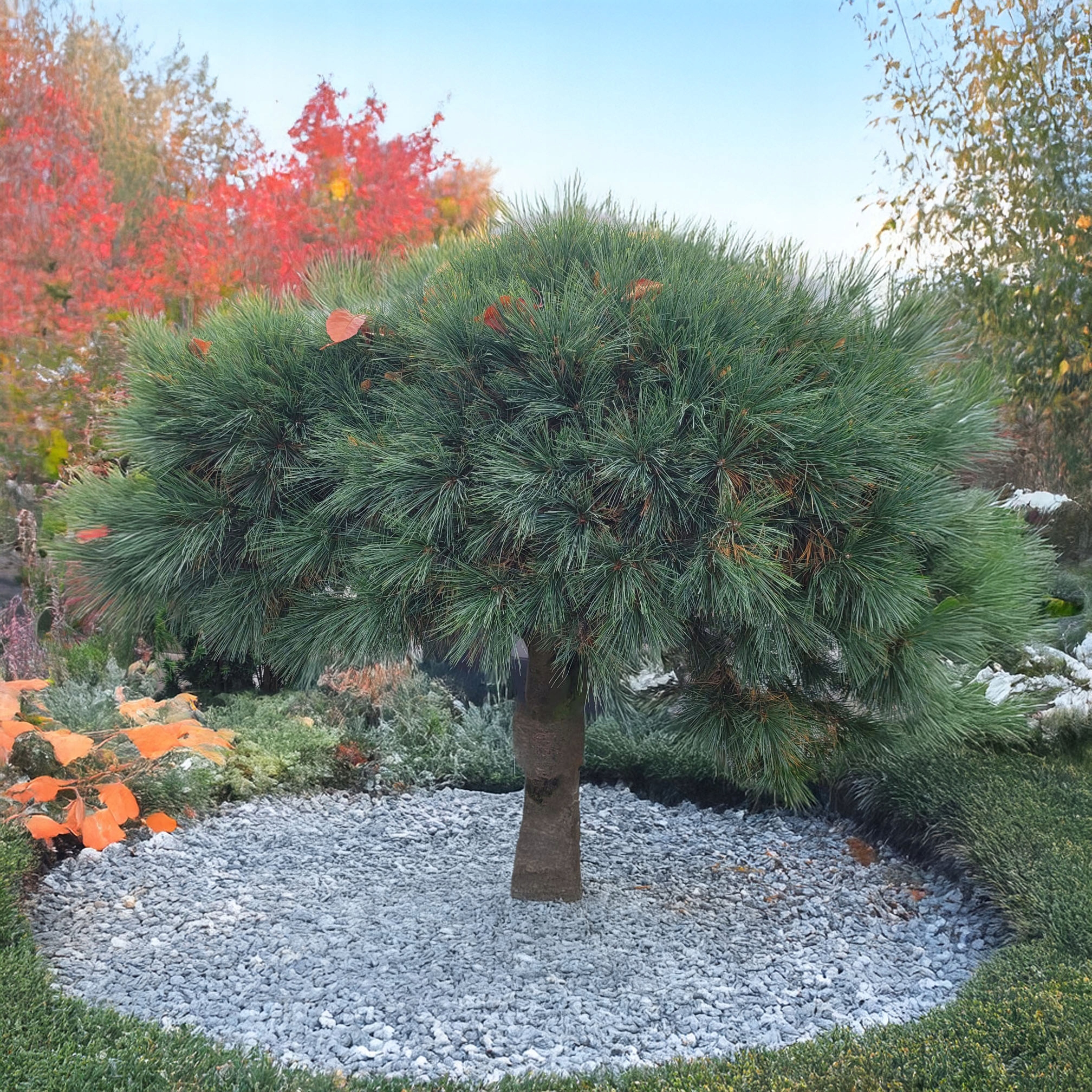 Pinus mugo ,,Varella” – to karłowa odmiana o kulistym, zwartym pokroju i ozdobnych, spiralnie skręconych igłach. Szczepiona na pniu tworzy efektowne, niskie drzewko idealne do małych ogrodów, skalniaków i uprawy w donicach.