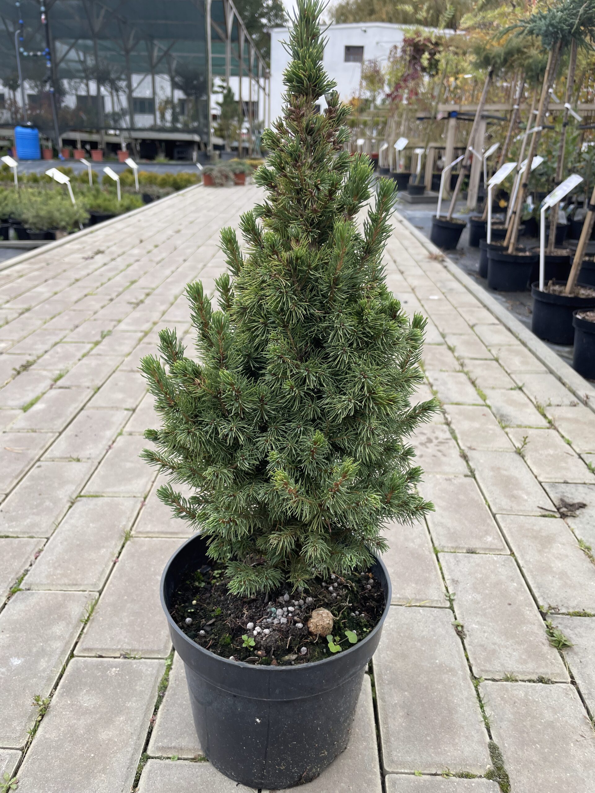 to niezwykle ozdobna, karłowa odmiana świerka o wolnym tempie wzrostu i regularnym, stożkowatym pokroju. Jego największym atutem są młode, wiosenne przyrosty — intensywnie kremowobiałe, kontrastujące z ciemnozielonymi, starszymi igłami. Efekt ten pojawia się w maju–czerwcu i trwa przez kilka tygodni, nadając roślinie unikalny, świetlisty wygląd.